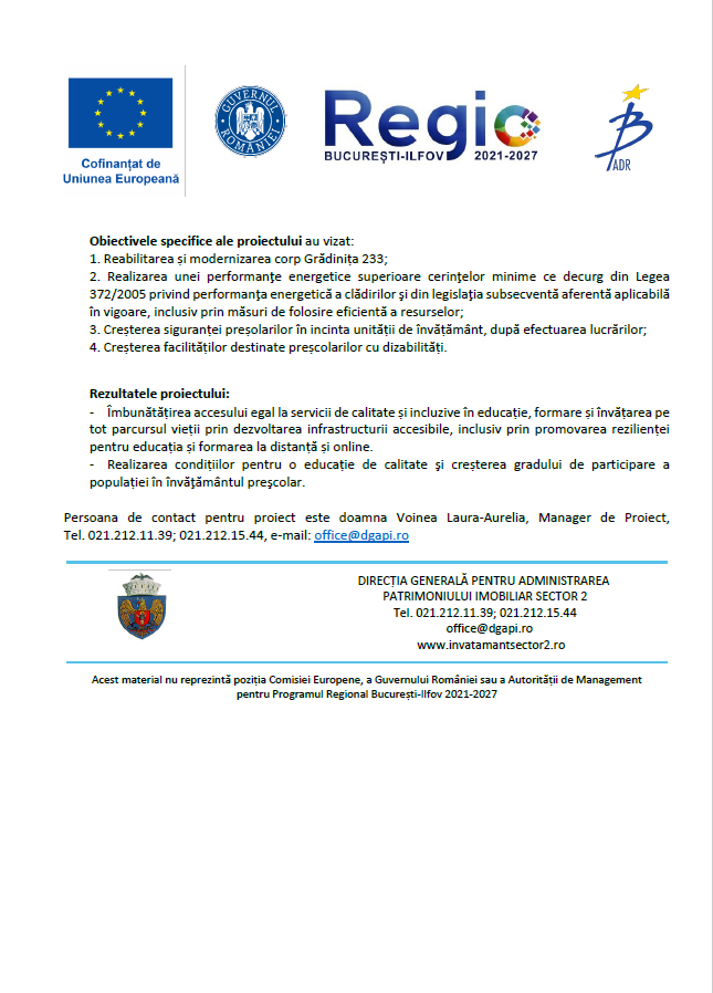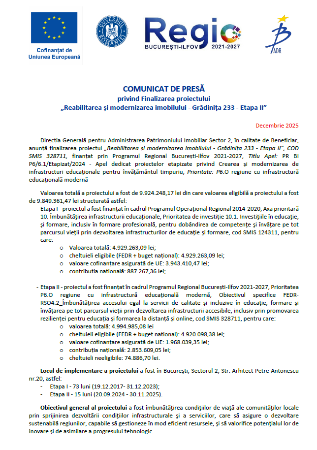Direcția Generală pentru Administrarea Patrimoniului Imobiliar Sector 2, în calitate de Beneficiar, anunță finalizarea proiectul „Reabilitarea și modernizarea imobilului - Grădinița 233 - Etapa II”, COD SMIS 328711, finanțat prin Programul Regional București-Ilfov 2021-2027, Titlu Apel: PR BI P6/6.1/Etapizat/2024 - Apel dedicat proiectelor etapizate privind Crearea și modernizarea de infrastructuri educaționale pentru învățământul timpuriu, Prioritate: P6.O regiune cu infrastructură educațională modernă