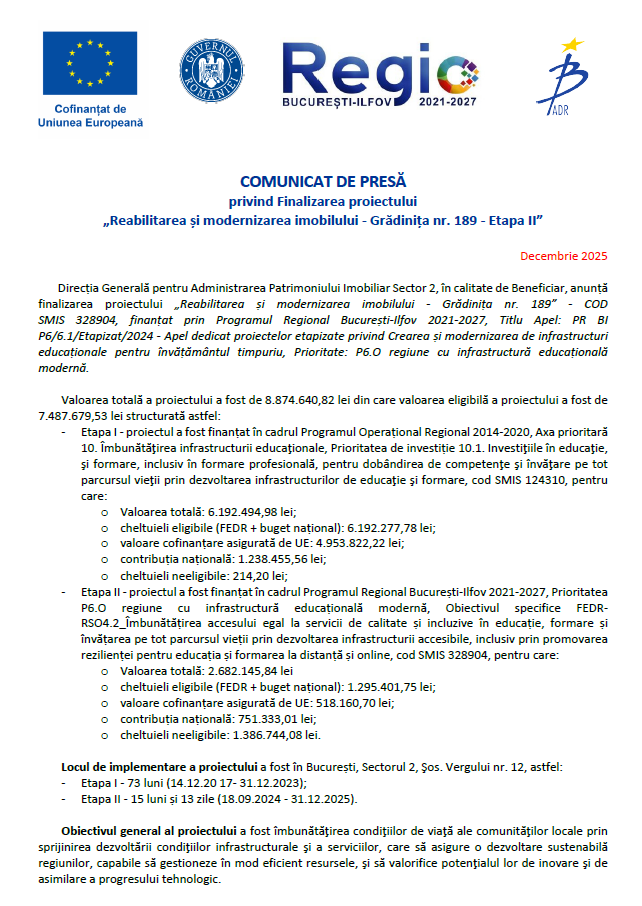 Direcția Generală pentru Administrarea Patrimoniului Imobiliar Sector 2, în calitate de Beneficiar, anunță finalizarea proiectului „Reabilitarea și modernizarea imobilului - Grădinița nr. 189” - COD SMIS 328904, finanțat prin Programul Regional București-Ilfov 2021-2027, Titlu Apel: PR BI P6/6.1/Etapizat/2024 - Apel dedicat proiectelor etapizate privind Crearea și modernizarea de infrastructuri educaționale pentru învățământul timpuriu, Prioritate: P6.O regiune cu infrastructură educațională modernă.