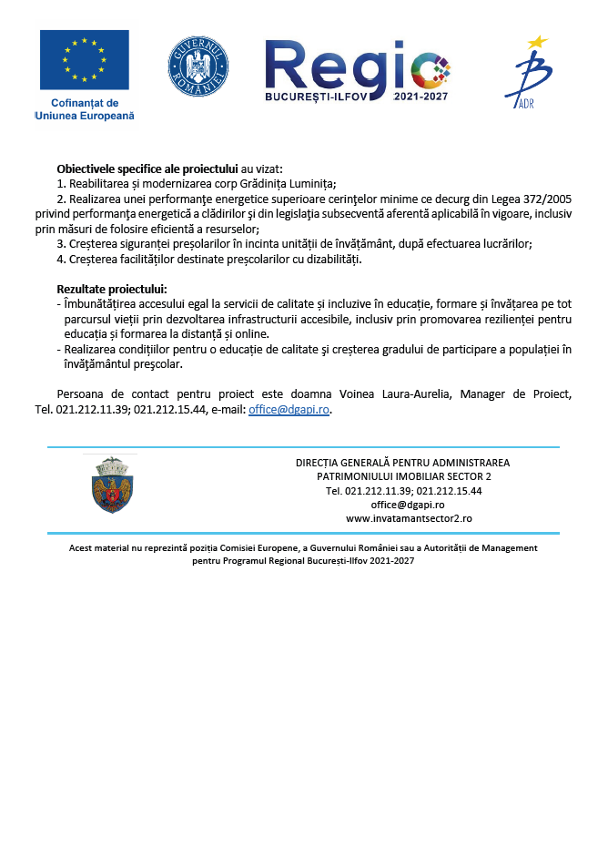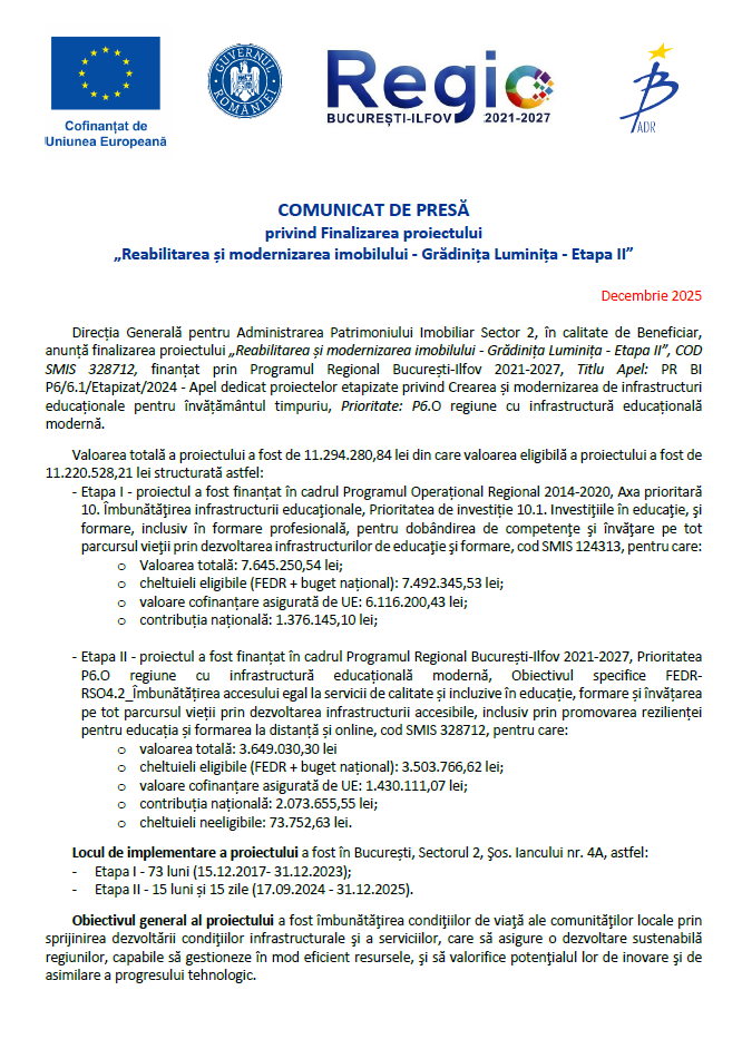 Direcția Generală pentru Administrarea Patrimoniului Imobiliar Sector 2, în calitate de Beneficiar, anunță finalizarea proiectului „Reabilitarea și modernizarea imobilului - Grădinița Luminița - Etapa II”, COD SMIS 328712, finanțat prin Programul Regional București-Ilfov 2021-2027, Titlu Apel: PR BI P6/6.1/Etapizat/2024 - Apel dedicat proiectelor etapizate privind Crearea și modernizarea de infrastructuri educaționale pentru învățământul timpuriu, Prioritate: P6.O regiune cu infrastructură educațională modernă.