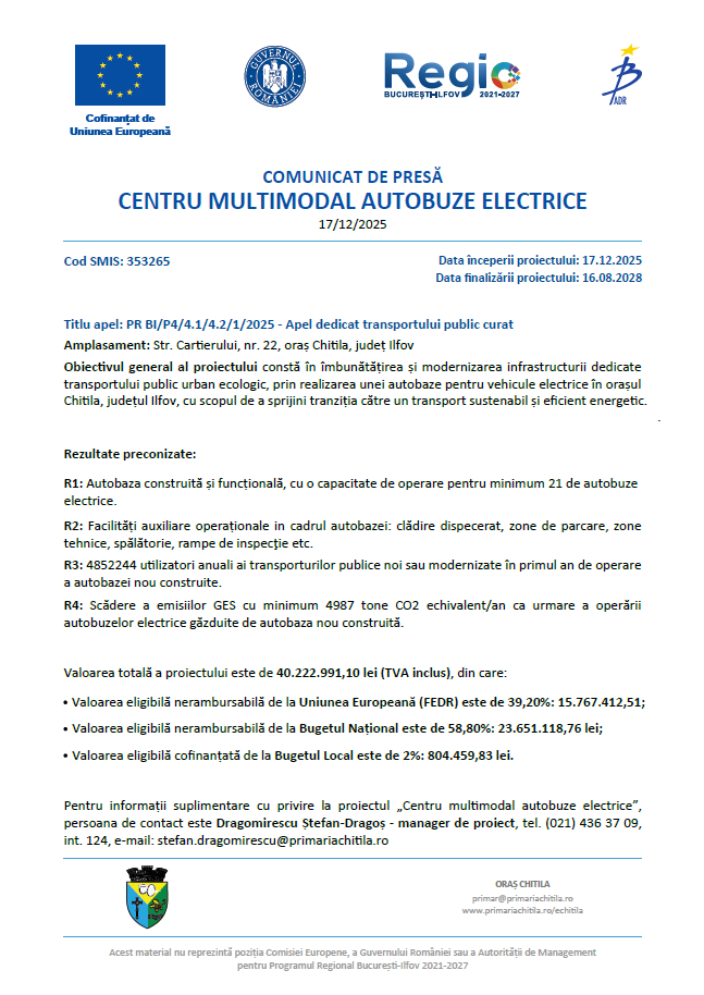 Pentru informații suplimentare cu privire la proiectul „Centru multimodal autobuze electrice", persoana de contact este Dragomirescu Ştefan-Dragoş - manager de proiect, tel. (021) 436 37 09, int. 124, e-mail: stefan.dragomirescu@primariachitila.ro