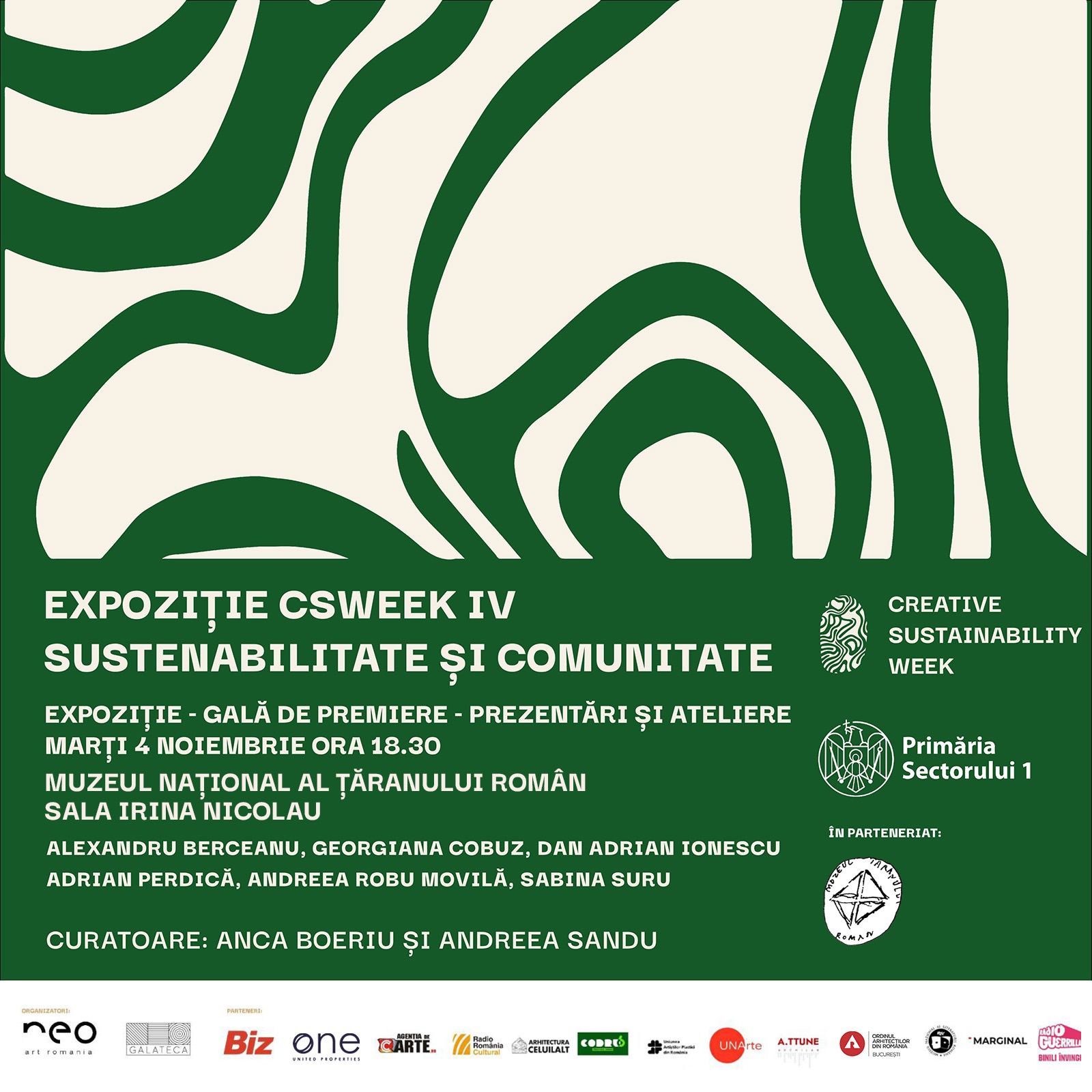 Cea de-a patra ediție a CSWeek – Săptămâna Sustenabilității Creative continuă marți, 4 noiembrie 2025, cu vernisajul expoziției intitulate „Comunitate și sustenabilitate”, prezentări și workshopuri, precum și gala de premiere a participanților, tineri, creatori și organizații non-profit din Sectorul 1 care au răspuns la programul nostru dedicat promovării inițiativelor verzi și sustenabile, transformând experiența lor într-un exemplu pentru viitor. Evenimentul este organizat la Muzeul Național al Țăranului Român, Șoseaua Kiseleff nr. 3, sala Irina Nicolau, începând cu ora 18.30,  de Asociația NeoArt România și Galateca, finanțat de Primăria Sectorului 1.