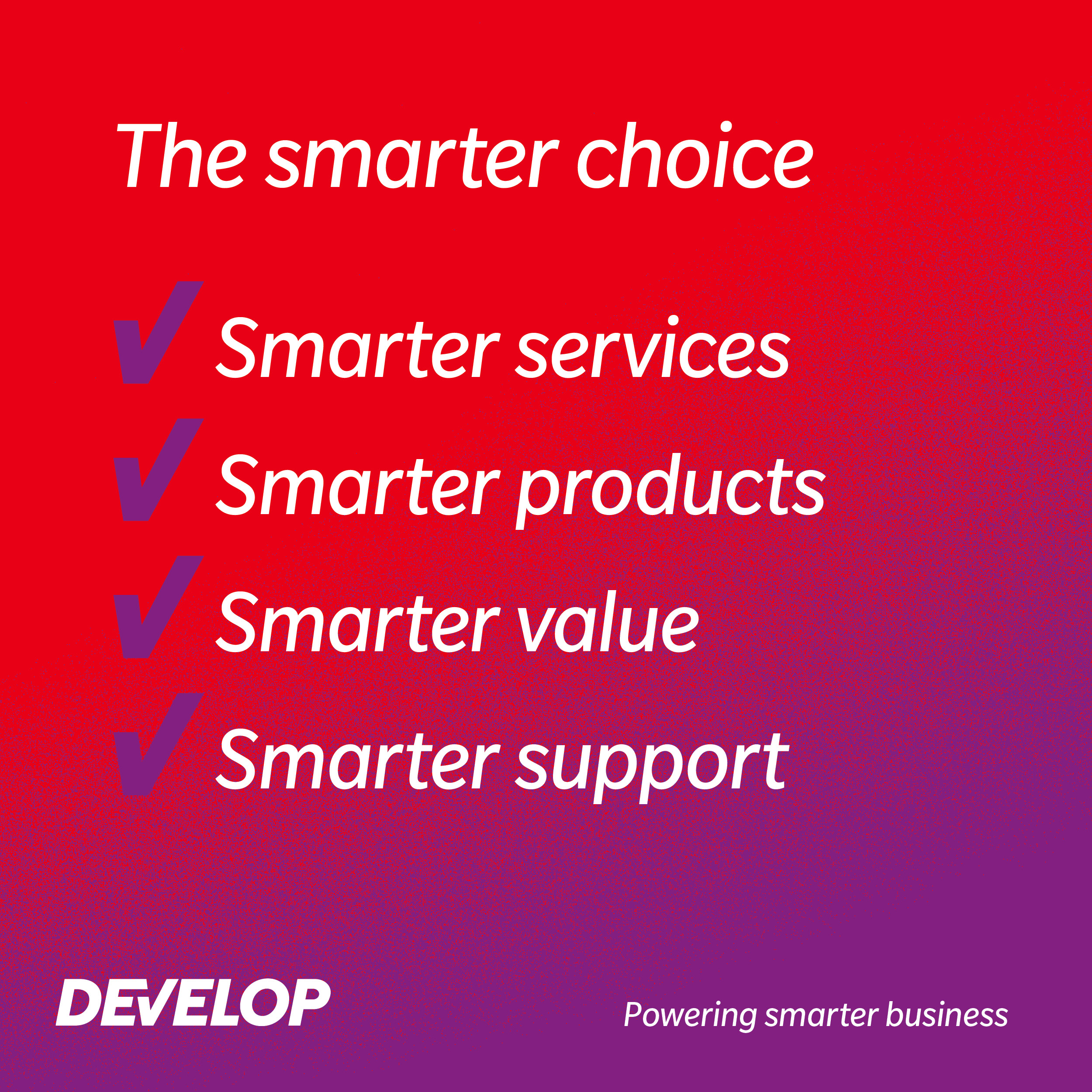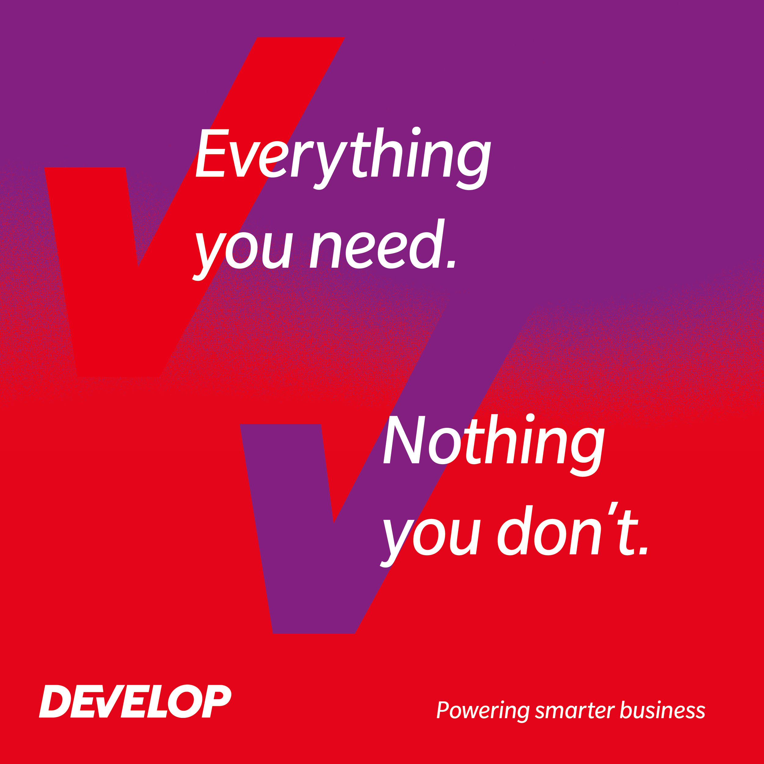 Prin sloganul „Powering smarter business”, DEVELOP își propune să ajute companiile să obțină echilibrul optim între productivitate, eficiență și costuri, oferind tot ce este necesar – și nimic în plus.