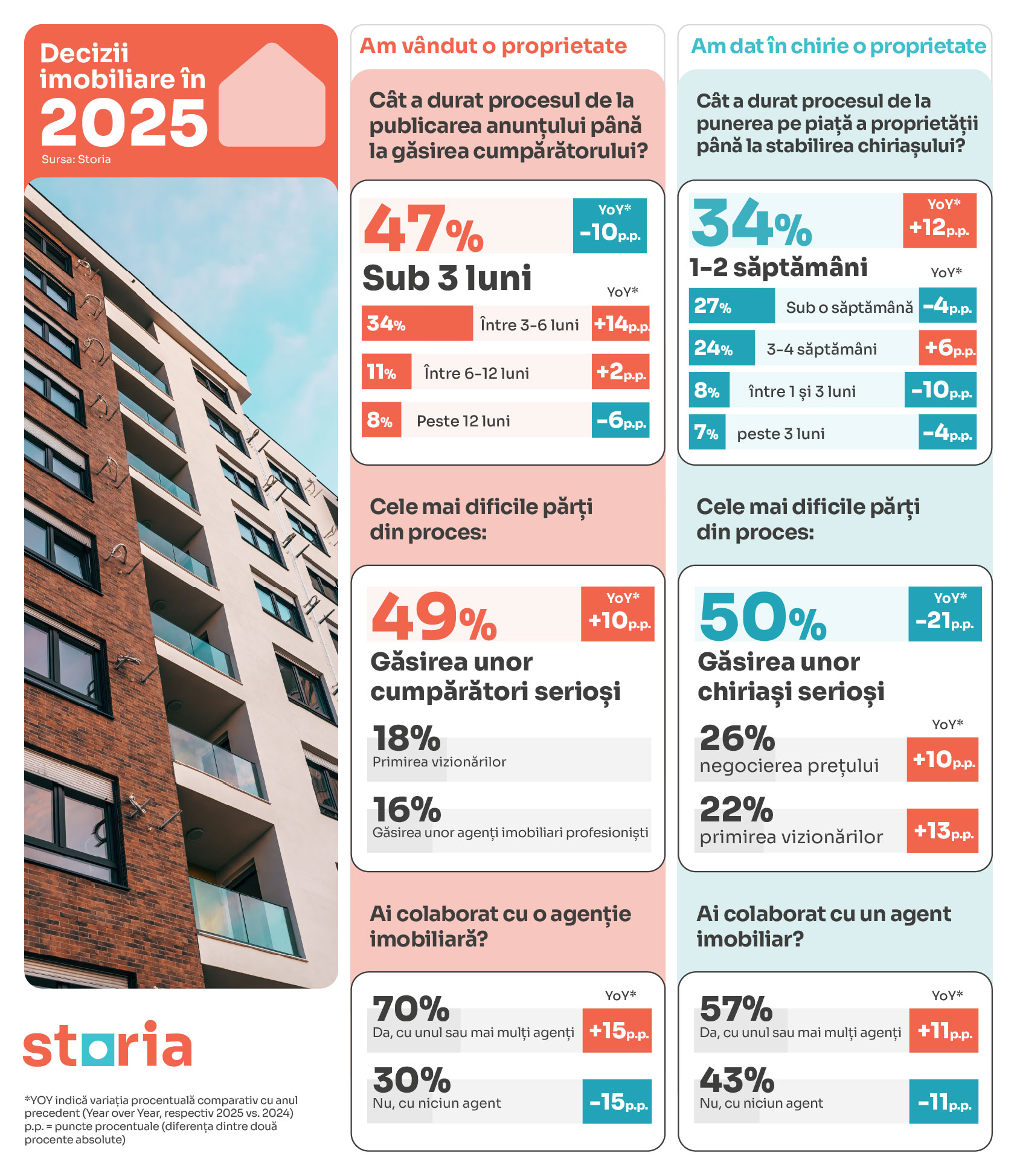 În cazul respondenților care au vândut o proprietate în 2025, procesul de la publicarea anunțului până la găsirea cumpărătorului a durat sub 3 luni pentru 47% dintre respondenți, cu 10 puncte procentuale mai puțin decât în 2024. În schimb, 34% dintre respondenți au avut nevoie de trei până la șase luni, o creștere semnificativă de 14 puncte procentuale față de anul trecut. Pentru 11% dintre aceștia procesul a durat între 6 și 12 luni, iar 8% au așteptat peste un an.