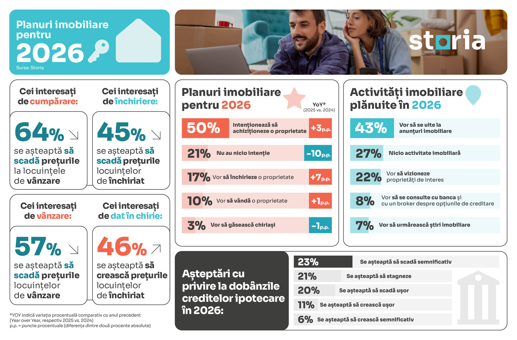 După un 2025 marcat de prudență și mai puține achiziții, românii privesc cu optimism piața imobiliară: 8 din 10 respondenți ai sondajului plănuiesc să facă tranzacții imobiliare în 2026, iar jumătate intenționează să cumpere o locuință, conform celui mai recent sondaj recurent realizat de Storia – cea mai vizitată platformă imobiliară din România. În plus, majoritatea anticipează scăderi de prețuri și dobânzi, inclusiv vânzătorii.