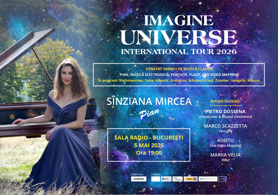Pian, percuții, flaut, muzică electronică și live video mapping se vor reuni într-o nouă serie de concerte imersive de muzică clasică în cadrul „IMAGINE Universe” TOUR 2026, sub semnătura inconfundabilă a pianistei și compozitoarei române Sînziana Mircea, solista seriei de concerte.