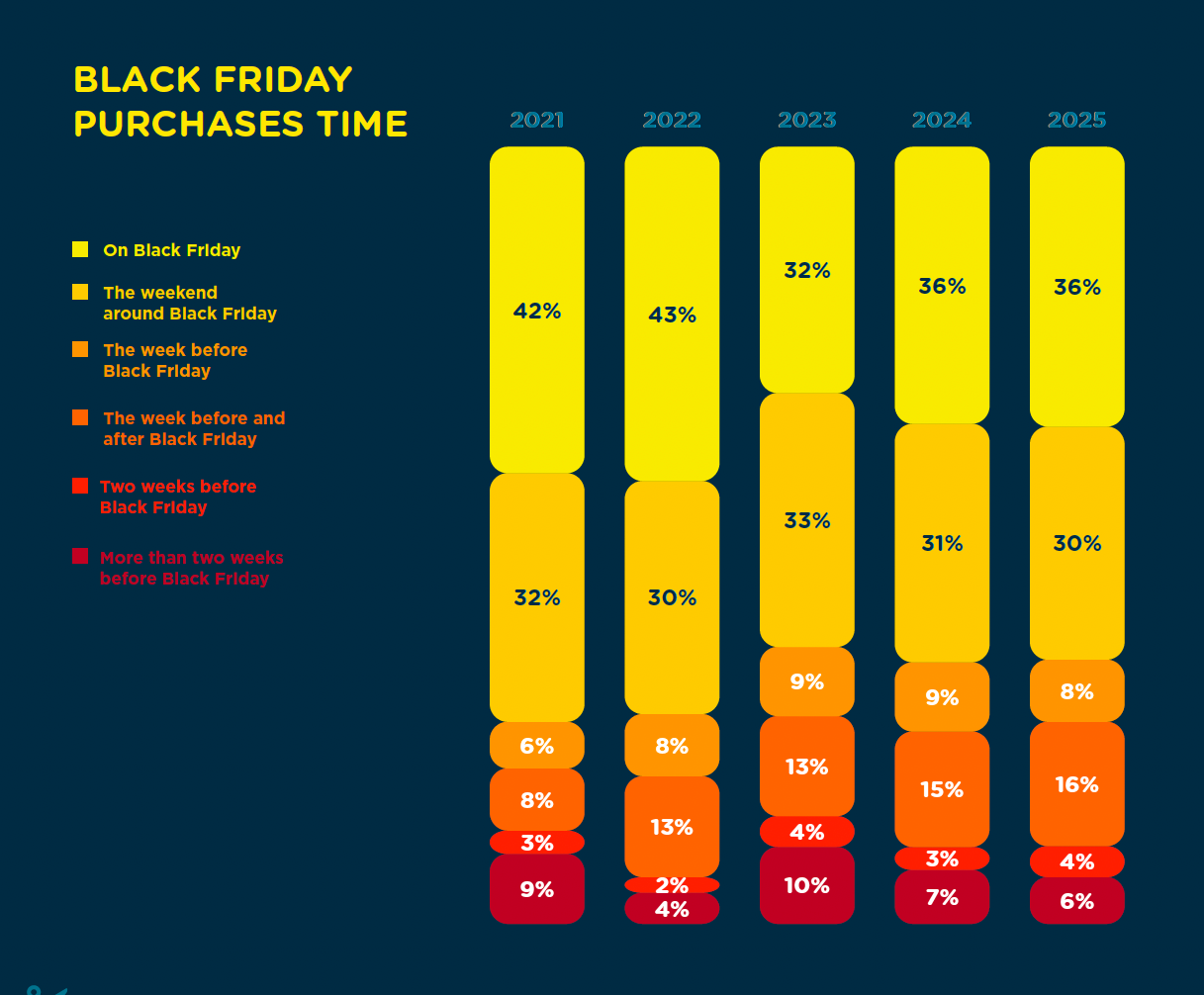 Interesul pentru Black Friday este tot mai mult stimulat de campaniile lansate înainte de startul oficial al evenimentului. Un număr tot mai mare de consumatori afirmă că promoțiile timpurii le cresc interesul, iar tot mai mulți își încep documentarea cu 1–4 săptămâni înainte. În schimb, căutările de ultim moment scad, semn că deciziile sunt luate din timp.
