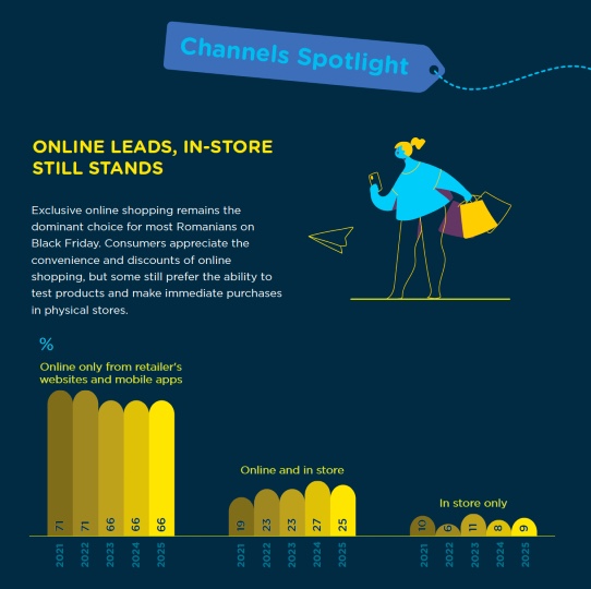 Cumpărăturile online rămân canalul dominant de Black Friday, datorită comodității și accesului rapid la reduceri. Cu toate acestea, magazinele fizice își păstrează relevanța pentru anumite categorii de produse, unde testarea sau achiziția imediată sunt importante. Telefonul mobil rămâne dispozitivul preferat, atât pentru planificare, cât și pentru cumpărare.