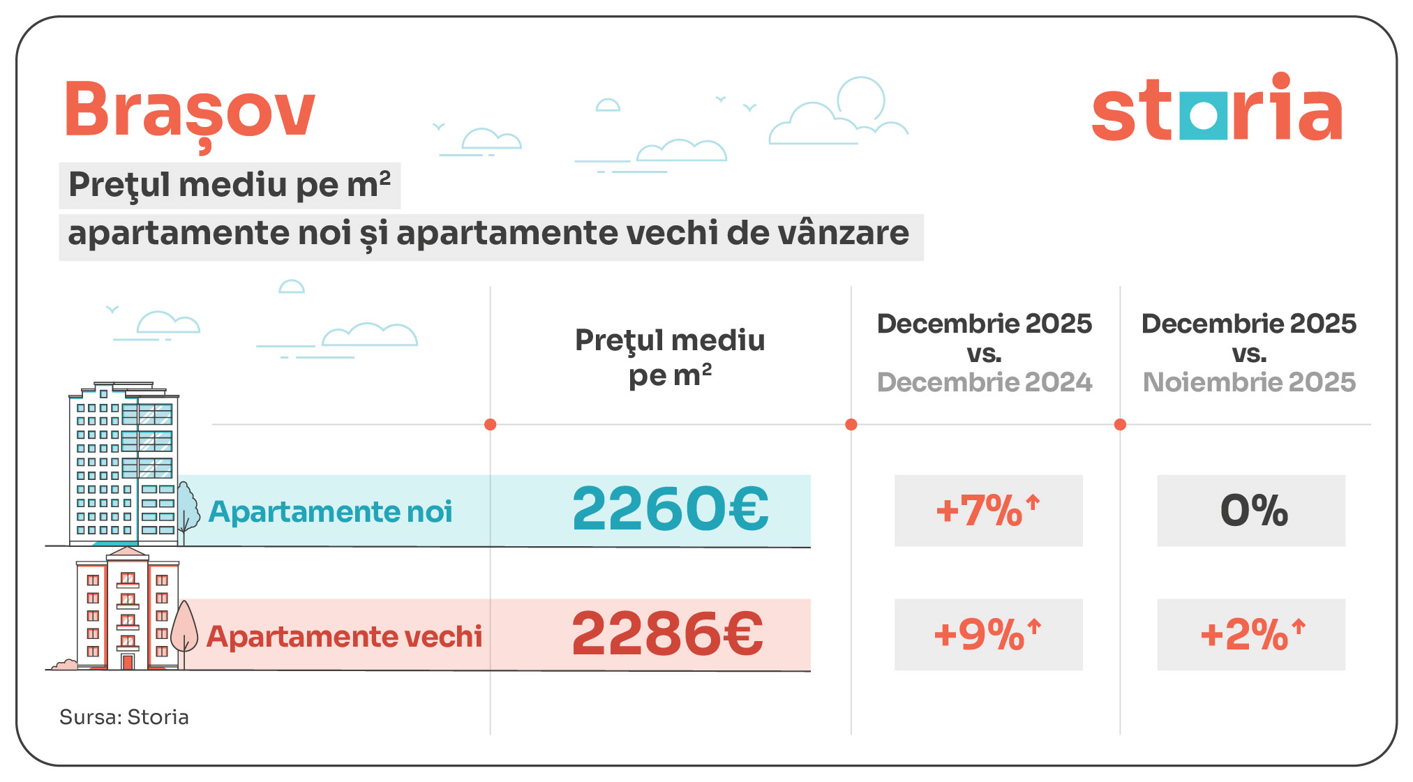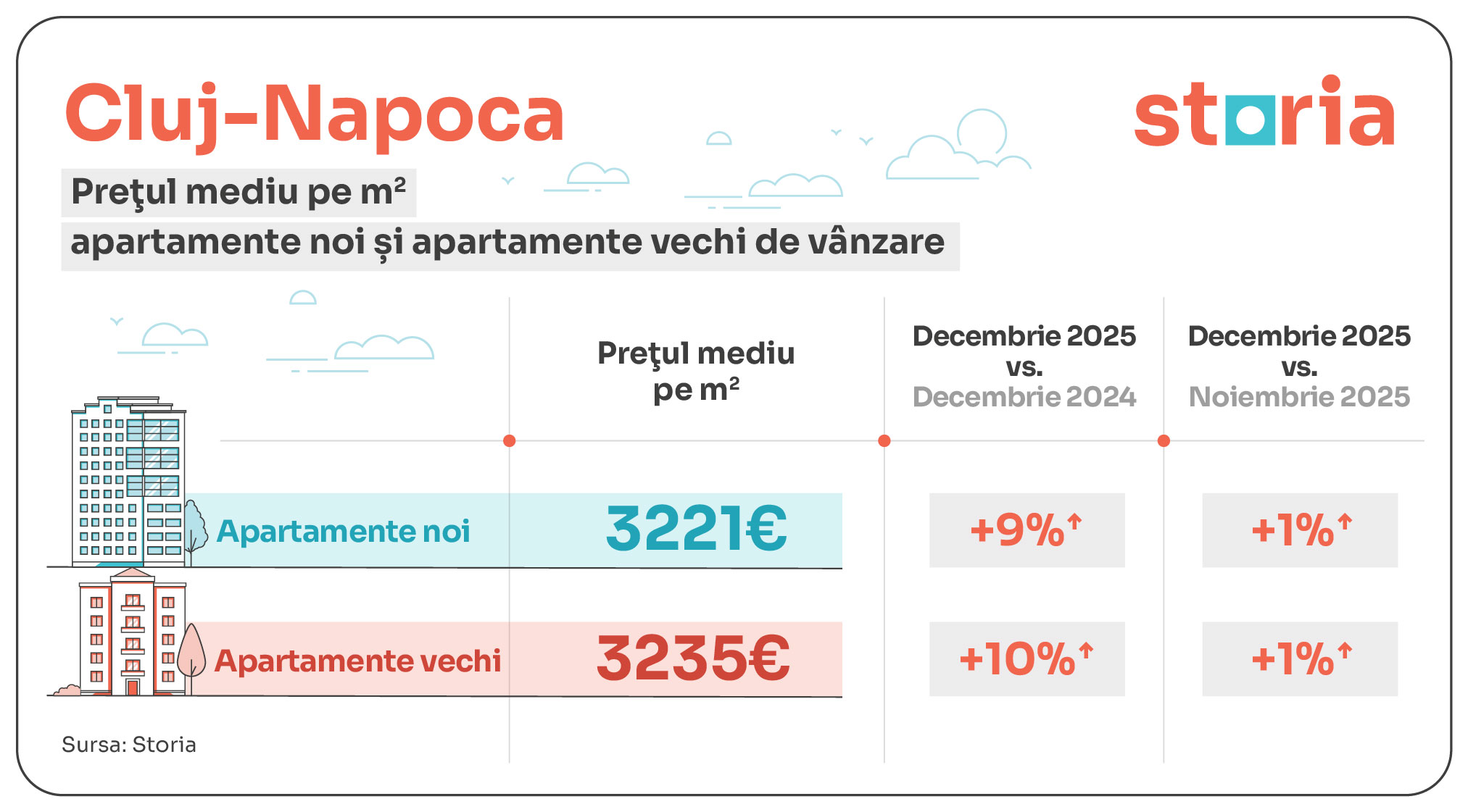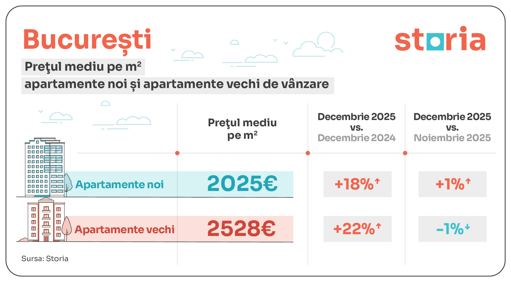 În ansamblu, piața imobiliară din România a înregistrat creșteri pe linie pentru prețurile solicitate în decembrie 2025 în cele mai mari 9 orașe ale țării pe parcursul anului trecut, iar acest lucru este valabil atât pentru locuințele noi, cât și pentru locuințele vechi. Totuși, conform datelor Storia, creșterile au variat semnificativ de la un oraș la altul sau între apartamentele vechi și cele noi din același oraș, în funcție de cererea din partea cumpărătorilor, dar și în funcție de numărul de locuințe noi livrate și de zonele în care acestea au fost construite.