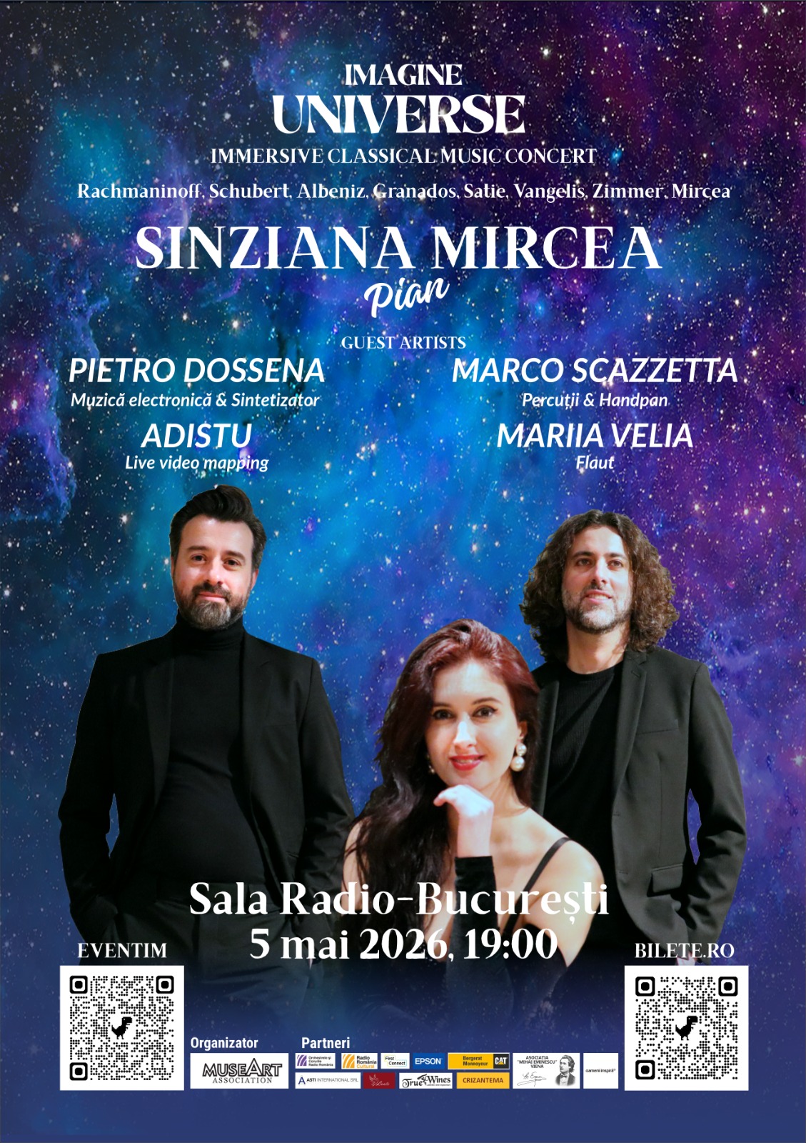 Privind spre viitor, Sînziana Mircea continuă să redefinească granițele spectacolului de muzică clasică prin Turneul Internațional „IMAGINE UNIVERSE”, un concept imersiv ce a debutat cu succes la Milano pe 15 ianuarie. Acest proiect ambițios, care va ajunge pe 5 mai la Sala Radio din București, înainte de a cuceri scenele legendare de la Wiener Konzerthaus din Viena (20 iunie) și Mozarteum din Salzburg (10 iulie), reprezintă o sinteză fascinantă între arta pianistică și tehnologia modernă. Alături de artiști invitați precum Pietro Dossena (muzică electronică), Adistu (live video mapping), Marco Scazzetta (percuție) și Mariia Velia (flaut), Sînziana Mircea creează un univers multisenzorial unde compoziții de Rachmaninoff, Schubert sau Albeniz se întâlnesc cu sonoritățile contemporane semnate de Hans Zimmer sau Vangelis, dar și cu compoziții proprii. Turneul va reveni în România în această toamnă, cu reprezentații Filarmonicii din Brăila pe 2 octombrie și în cadrul Kuriozum Festival de la Prejmer pe 3 octombrie, oferind publicului o experiență vizuală și sonoră totală, care transformă tradiția clasică într-un spectacol complet al secolului XXI. Biletele sunt puse în vânzare pe site-urile: Eventim și Bilete.ro