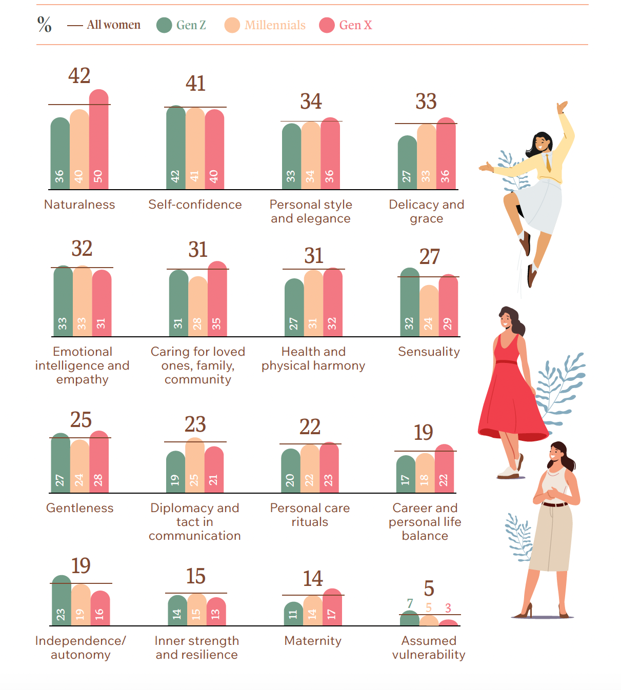 Indiferent de generație, femeile asociază feminitatea în primul rând cu atitudinea, autenticitatea și forța interioară, și mult mai puțin cu aspectul fizic sau cu standardele estetice tradiționale. Studiul conturează o schimbare clară de perspectivă asupra identității feminine, într-un context social și digital în continuă transformare.