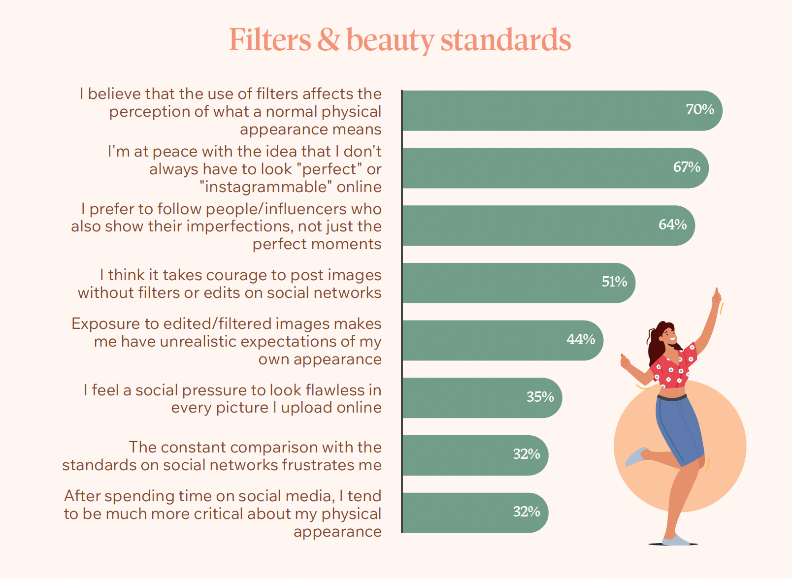 Studiul evidențiază impactul emoțional al rețelelor sociale asupra femeilor. Gen Z este generația cea mai influențată de comparațiile din social media, fiind mai predispusă să își editeze fotografiile sau să își bazeze percepția de sine pe reacțiile online.